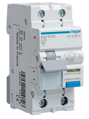 HAGER дифференциальный автомат 1P+N, тип A, C, 20А, 30mA, ADA970D
